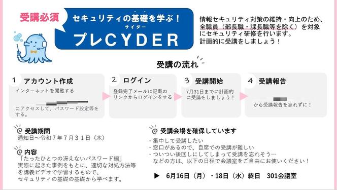 2025年度1期「たったひとつの冴えないパスワード編」は、2024年度後半に管部職が受講したものと同じコンテンツなので、全職員向け研修として活用をしました。